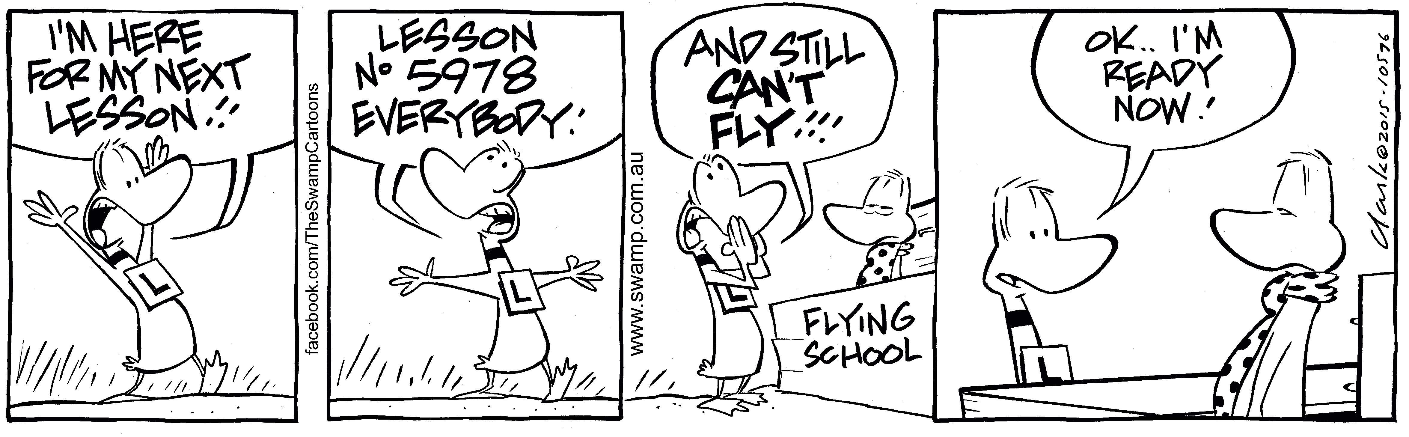 An original black & white Swamp Cartoon called, “Ding Duck Lesson 5978”.