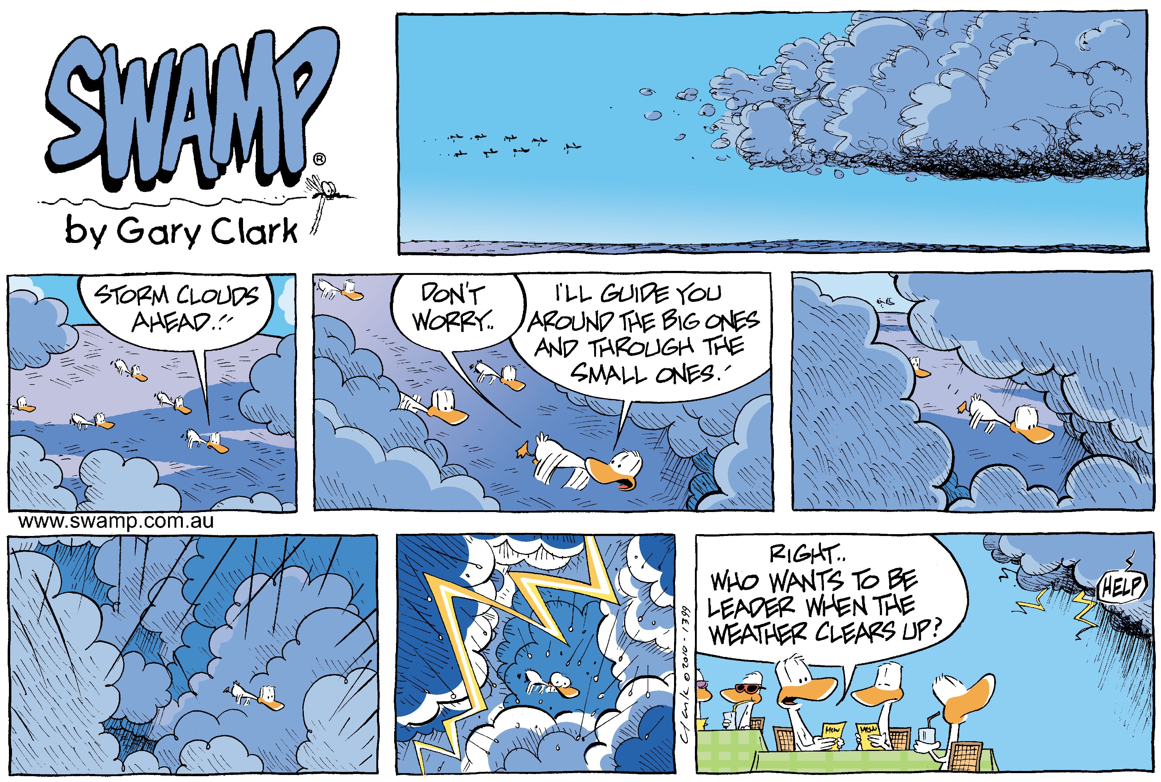 A flock of ducks is flying in formation straight into storm clouds but their leader confidently says to follow his lead.