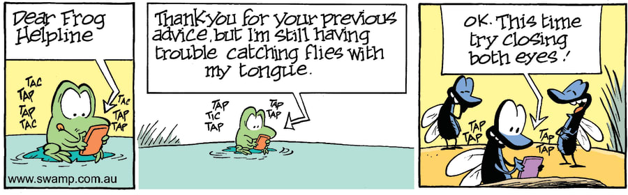 Mort phones frog helpline for advice catching flies with his tongue not realising talking to flies.