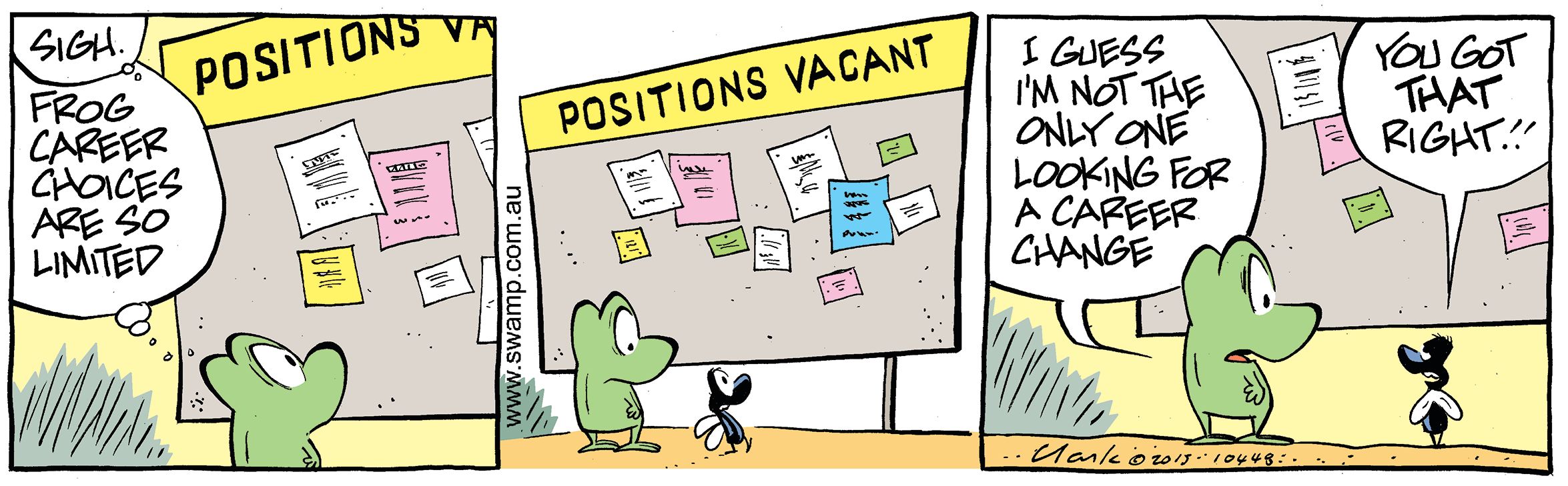 Mort Frog is looking at the positions vacant board and laments the lack of career choices for frogs.