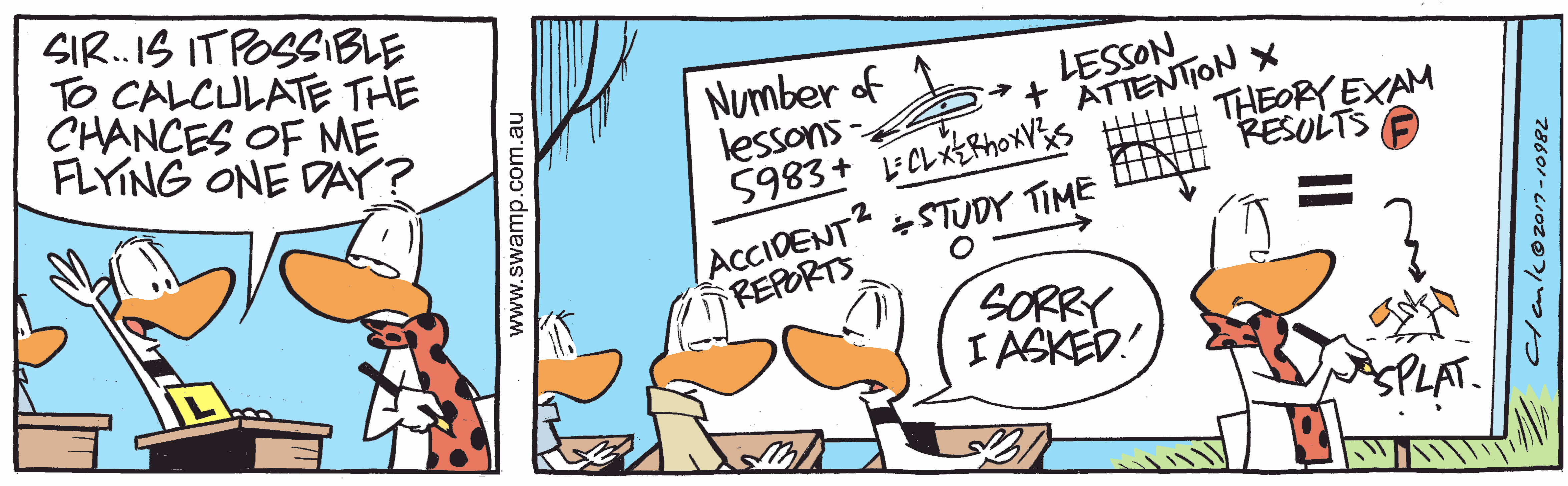 An original black & white Swamp Cartoon called “Chances of Flying”. Some questions from flying students are priceless. Ding Duck has a moment of regret!