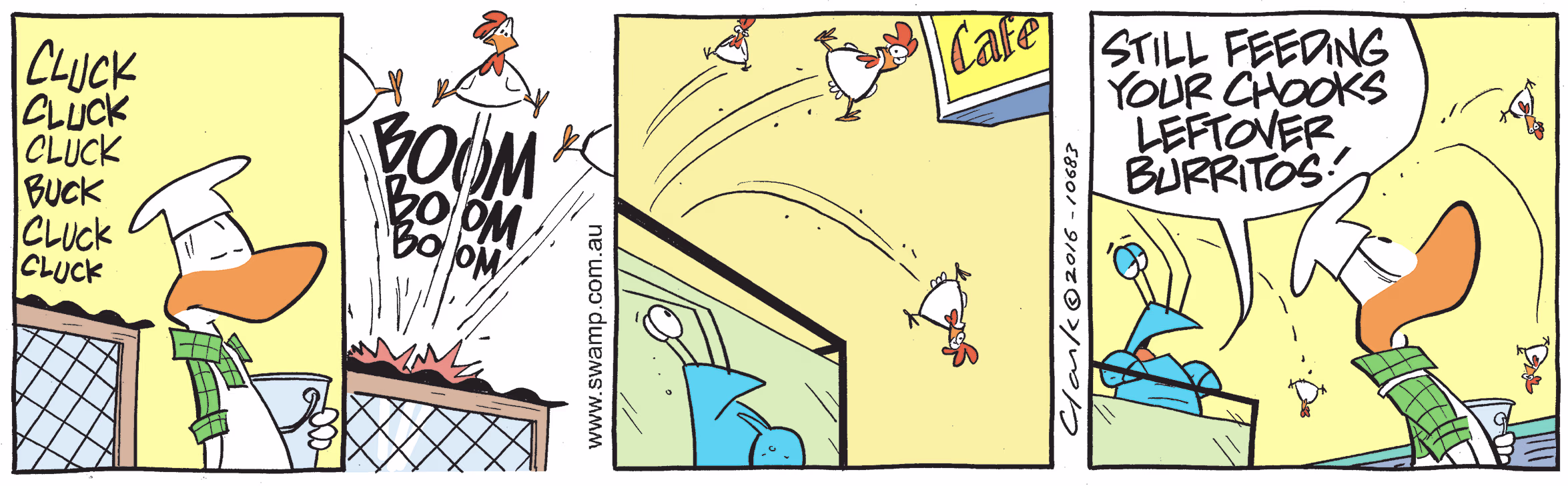 An original black & white Swamp Cartoon called, “Leftover Burritos”. They sure pack a punch!