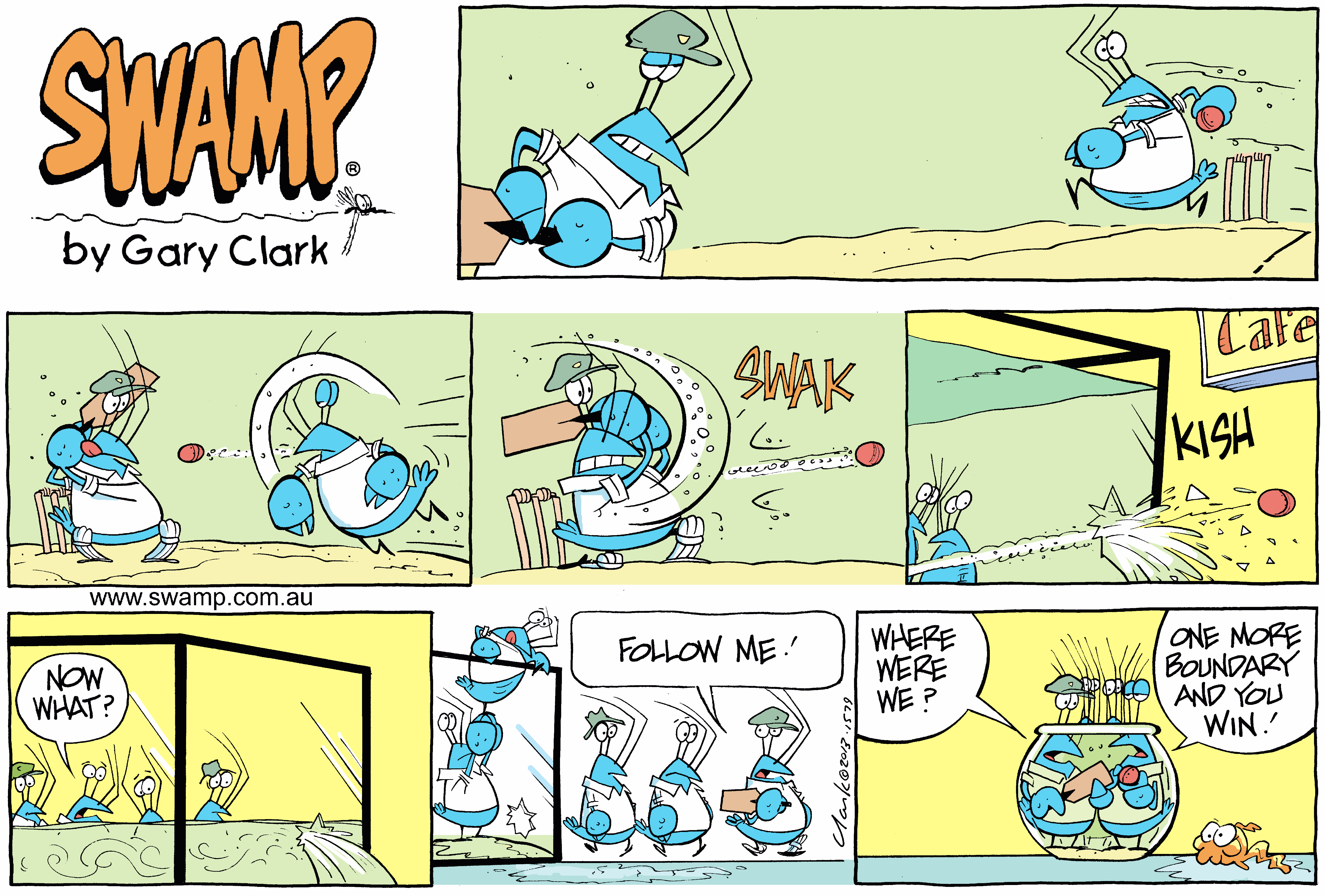 An original black & white Swamp Sunday Cartoon called “Game of Cricket”. To pass the time, Bob Crayfish has a brilliant idea of playing cricket. All was going well until someone belted the ball!