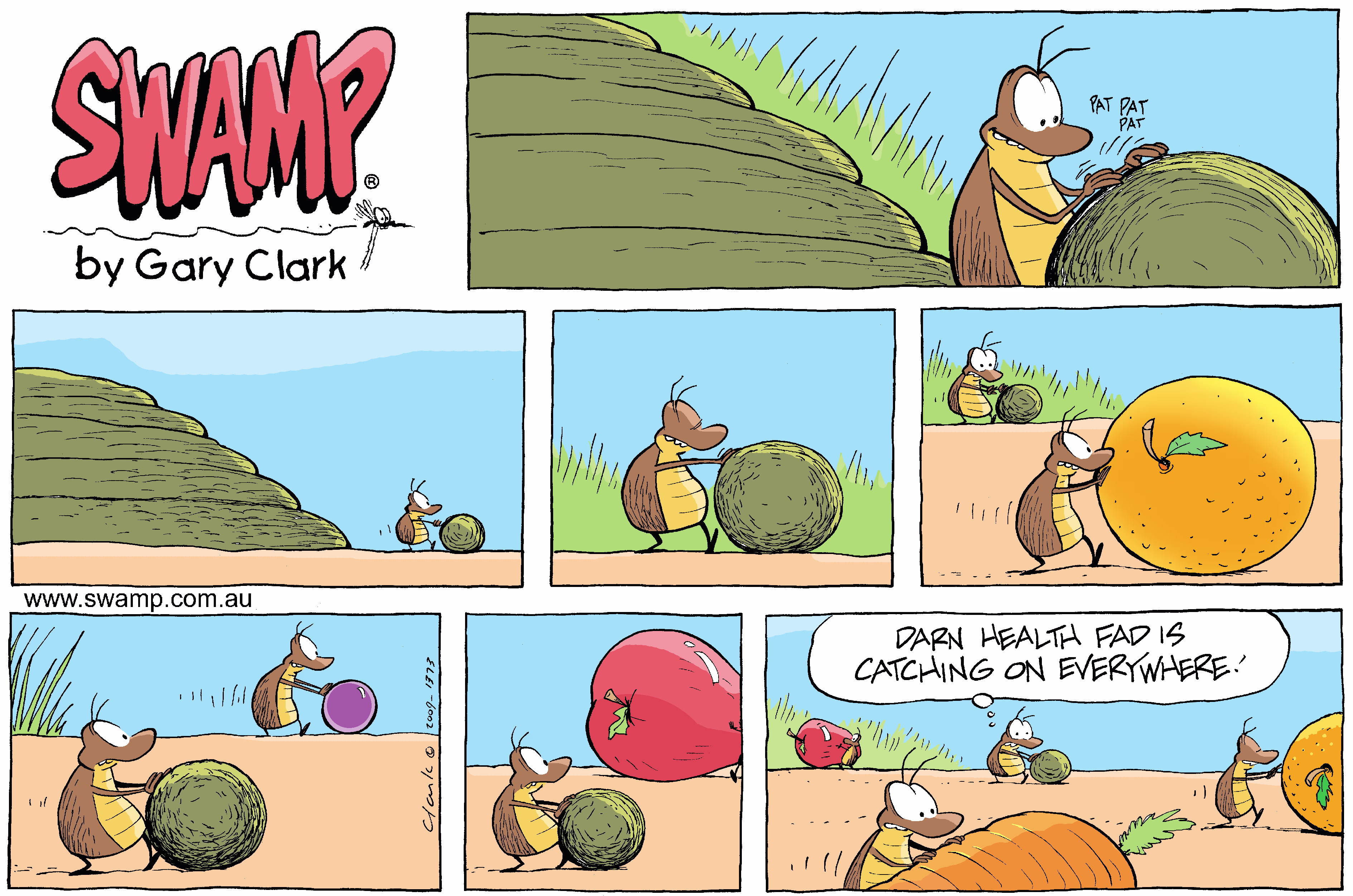 An original black & white Swamp Sunday Cartoon called “Health Fad”. There’s no limit to where health fads will appear. Even the Dung Beetles are not exempt!