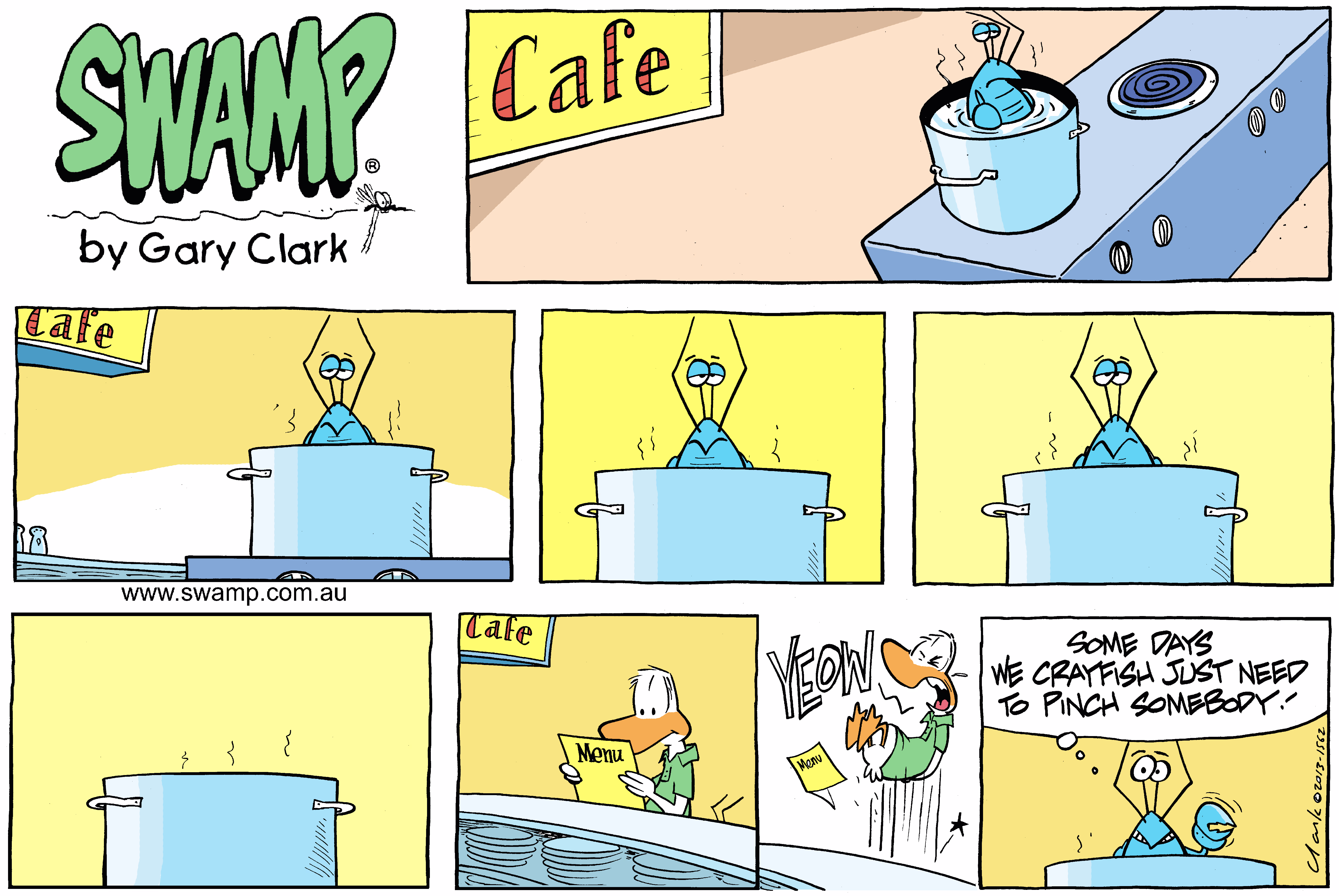 An original black & white Swamp Sunday Cartoon called “Pinch Somebody”. After simmering in a pot for hours, of course, a crayfish has to do what he’s born to do!! Besides, what’s better than pinching a diner who may eat you?