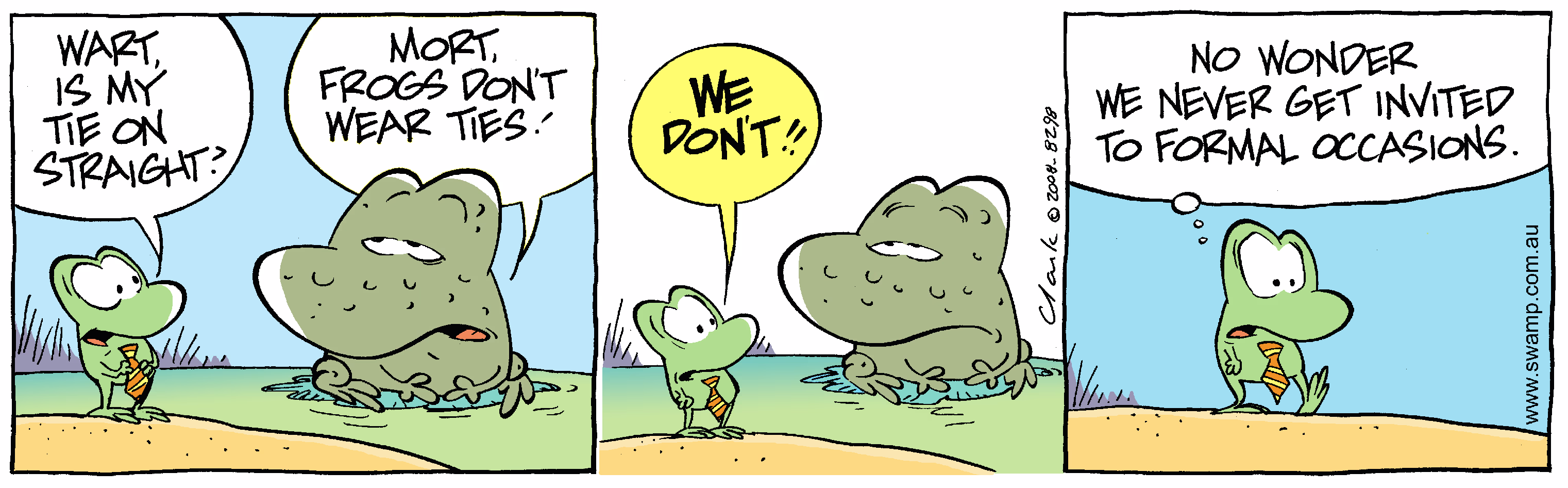 An original black & white Swamp Cartoon called, “Tie on Straight”.