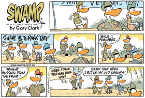Cartoon ID Categories Air Traffic ControllerAntsArmy DucksAviator DucksBludgerigar BirdBob CrayfishCarrier PigeonCheese & Chives RatsChefChickenscockroachesDing DuckDing's DadDung BeetlesFishFliesFlying School InstructorKamikaze DuckMosquitoesOld Man Croc & Nit-Picker BirdPigspilotsPoultry SquadRogue CrocsSwamp DucksSwamp ToursSwamp VetTurtle & SnailUncategorizedWart & Mort FrogsWild DucksWorms KeyWords Location Exclude Sunday Featured Character Featured Character 11176 (20/03/23) : Entrance to Drainpipe S1638 (19/03/23) : Phone Country Cousin 11175 (18/03/23) : Frustrating Game 11166 (17/03/23) : Stretching the Web 11165 (16/03/23) : Take-off Attempt 11164 (15/03/23) : Delivering Good News 11163 (14/03/23) : Start Washing Up 11162 (13/03/23) : Make a Confession S1613 (12/03/23) : Swamp Veterans Day Previous Next