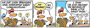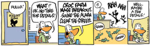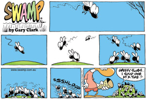 Cartoon ID Categories Air Traffic ControllerAntsArmy DucksAviator DucksBludgerigar BirdBob CrayfishCarrier PigeonCheese & Chives RatsChefChickenscockroachesDing DuckDing's DadDung BeetlesFishFliesFlying School InstructorKamikaze DuckMosquitoesOld Man Croc & Nit-Picker BirdPigspilotsPoultry SquadRogue CrocsSwamp DucksSwamp ToursSwamp VetTurtle & SnailUncategorizedWart & Mort FrogsWild DucksWorms KeyWords Location Exclude Sunday Featured Character Featured Character 10072 (06/10/25) : All You Can Eat Buffet S1042 (05/10/25) : Mouth Wash 10071 (04/10/25) : One of those Days 10070 (03/10/25) : Enemy Communications 10069 (02/10/25) : Mass Breakout Comic 10068 (01/10/25) : Report Just In 10067 (30/09/25) : Take-off Technique 10066 (29/09/25) : Early Bird Gets the Worm S1041 (28/09/25) : Greed Previous Next