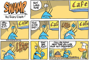 Cartoon ID Categories Air Traffic ControllerAntsArmy DucksAviator DucksBludgerigar BirdBob CrayfishCarrier PigeonCheese & Chives RatsChefChickenscockroachesDing DuckDing's DadDung BeetlesFishFliesFlying School InstructorKamikaze DuckMosquitoesOld Man Croc & Nit-Picker BirdPigspilotsPoultry SquadRogue CrocsSwamp DucksSwamp ToursSwamp VetTurtle & SnailUncategorizedWart & Mort FrogsWild DucksWorms KeyWords Location Exclude Sunday Featured Character Featured Character 9755 (11/12/24) : Size does Matter 9734 (10/12/24) : Dinner Time 9725 (09/12/24) : His Turn to Break S1746 (08/12/24) : Pained Expression 9724 (07/12/24) : Hole in The Pocket 9723 (06/12/24) : Black Ball in Side Pocket 9722 (05/12/24) : Take-off Today 9713 (03/12/24) : Piranhas Beneath Them 9706 (02/12/24) : Brutus Cockroach in Sugar Bowl Previous Next