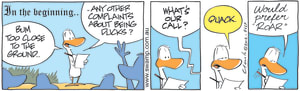 Cartoon ID Categories Air Traffic ControllerAntsArmy DucksAviator DucksBludgerigar BirdBob CrayfishCarrier PigeonCheese & Chives RatsChefChickenscockroachesDing DuckDing's DadDung BeetlesFishFliesFlying School InstructorKamikaze DuckMosquitoesOld Man Croc & Nit-Picker BirdPigspilotsPoultry SquadRogue CrocsSwamp DucksSwamp ToursSwamp VetTurtle & SnailUncategorizedWart & Mort FrogsWild DucksWorms KeyWords Location Exclude Sunday Featured Character Featured Character 9692 (22/11/24) : Call my Lawyer Comic 9683 (21/11/24) : World Below Remains Unknown 9674 (20/11/24) : Encounter a Sudden Tail Wind 9672 (19/11/24) : Ding Duck Hazardous Winds 9669 (18/11/24) : Ducks Prefer Roar Call S1836 (17/11/24) : Pet Obedience School 9668 (16/11/24) : Check the Fine Print 9667 (15/11/24) : Aquatic Migratory Birds 9666 (14/11/24) : In the Beginning Previous Next