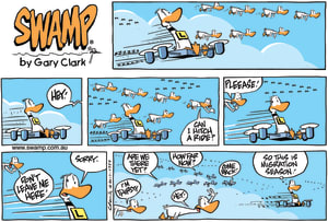 Cartoon ID Categories Air Traffic ControllerAntsArmy DucksAviator DucksBludgerigar BirdBob CrayfishCarrier PigeonCheese & Chives RatsChefChickenscockroachesDing DuckDing's DadDung BeetlesFishFliesFlying School InstructorKamikaze DuckMosquitoesOld Man Croc & Nit-Picker BirdPigspilotsPoultry SquadRogue CrocsSwamp DucksSwamp ToursSwamp VetTurtle & SnailUncategorizedWart & Mort FrogsWild DucksWorms KeyWords Location Exclude Sunday Featured Character Featured Character S1760 (25/08/24) : Chives Rat Drift Comic 9002 (24/08/24) : Tough Flight Theory Question 9001 (23/08/24) : More Rational Thinking 10528 (22/08/24) : Ding Duck Walking 10523 (21/08/24) : Flying Like Superman Comic 10521 (20/08/24) : Chives Rat Garbage Comic 10520 (19/08/24) : Bludgerigar Spring Comic S1759 (18/08/24) : His First Migration 10516 (17/08/24) : Swamp Chef Meat Pies Comic Previous Next